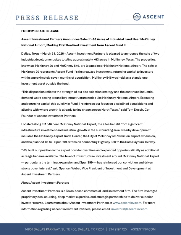 Ascent Investment Partners Announces Sale of ±63 Acres of Industrial Land Near McKinney National Airport, Marking First Realized Investment from Ascent Fund II